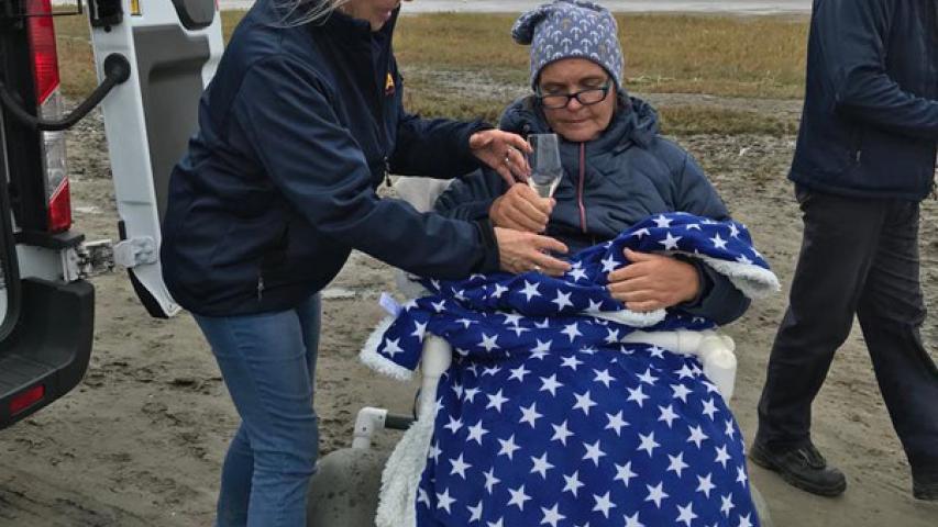 Beim Zwischenstopp in Husum genoss es die schwerkranke 56-Jährige sehr, das erste Mal wieder salzige Luft zu riechen und Schiffe zu gucken. Für unsere Wunscherfüller Andre Bredemeier und Elisabeth Klingenhoff gab es viel zu organisieren, da der Strand in Sankt Peter Ording über Nacht unbefahrbar geworden war. Also entschied man sich für den Südstrand, wo man sehr dicht ans Wasser fahren kann. Die Tourismus-Zentrale sorgte wie so oft sofort nach unserer Ankunft dafür, dass wir kostenlos einen Strandrollstuhl gebracht (!) bekamen und mit dem Wünschewagen noch etwas dichter ans Wasser durften. Ein großes Dankeschön dafür!