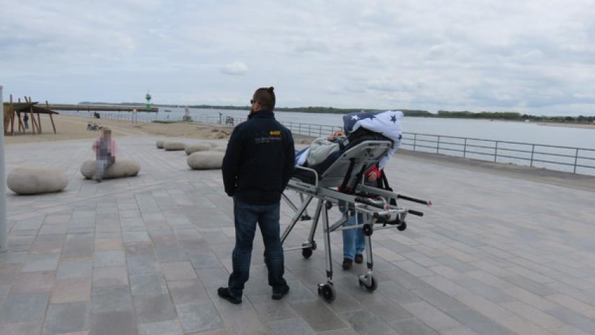 Da die Kraft zum Sitzen fehlte, ging es auf Wunsch des Gastes per Fahrtrage auf der Promenade am Wasser entlang. Am Maritim Hotel, wo das Ehepaar immer so gerne Urlaub gemacht hat, das Einlaufen der Schiffe zu beobachten, war für den 79-Jährigen das Highlight.
